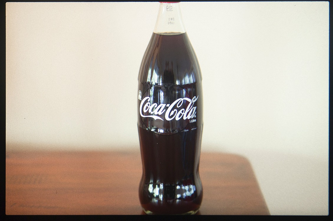 The photo below shows the viewfinder of the S2 (as captured by an EOS-M). I have attempted to focus on the center of the Coca-Cola logo using just the split-prism. If you look to the far left, you can see a slight distortion created by the micro-prism surrounding the split-prism. Remembering that the coca cola bottle is a cylindrical object, it would make sense that the edge of the logo is behind the plane of focus. In this way, both the split-prism and the micro-prism are used together to achieve and confirm focus.
